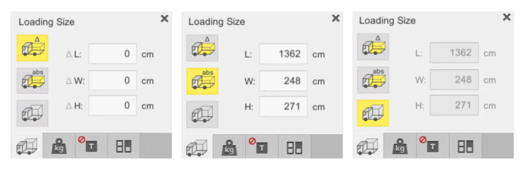 Three more icons will appear: with the help of the first one, you can choose how many centimeters or inches you want to increase or decrease the selected cargo space layout (if you want the layout to be smaller, simply add “-” before the number). The second icon allows you to change the absolute loading size layout of the entire cargo space. By clicking the last icon, the dimensions of the cargo space will return to their default size.