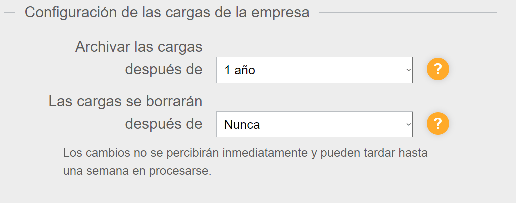 Una vez que haya cliqueado pestaña con su nombre, verá su página de perfil y, en la parte más baja de la sección Configuración de las cargas de la empresa, podrá elegir cuándo desea que se archiven sus cargas. Por ejemplo, puede ser después de un mes, seis meses o un año y tres meses. Además, justo debajo de esta configuración, podrá elegir después de cuánto tiempo desea que se eliminen sus cargas. Aquí también podrá elegir entre varias opciones. No borrarlas nunca es también una opción válida.
