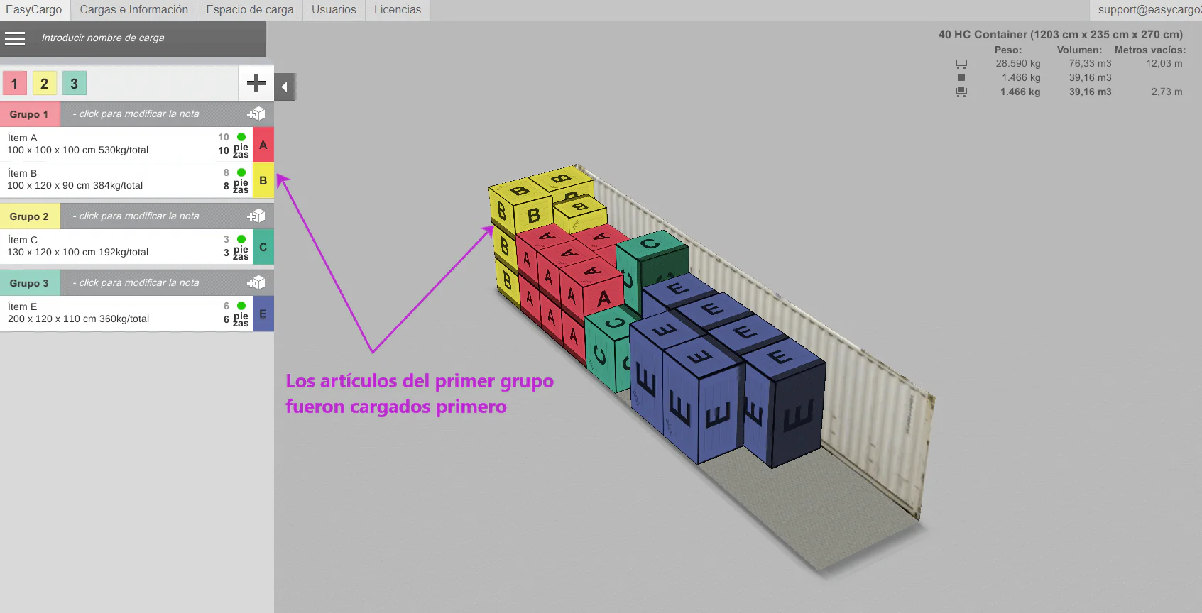 Los “Grupos de prioridad” también pueden ser útiles si es necesario reorganizar artículos en el plan de carga. El algoritmo carga primero las piezas más grandes de forma automática, pero existen casos en los que ese orden no es el más adecuado. En ese caso, se pueden utilizar los “Grupos de prioridad” para cambiar el orden de carga de los artículos, según sus necesidades.