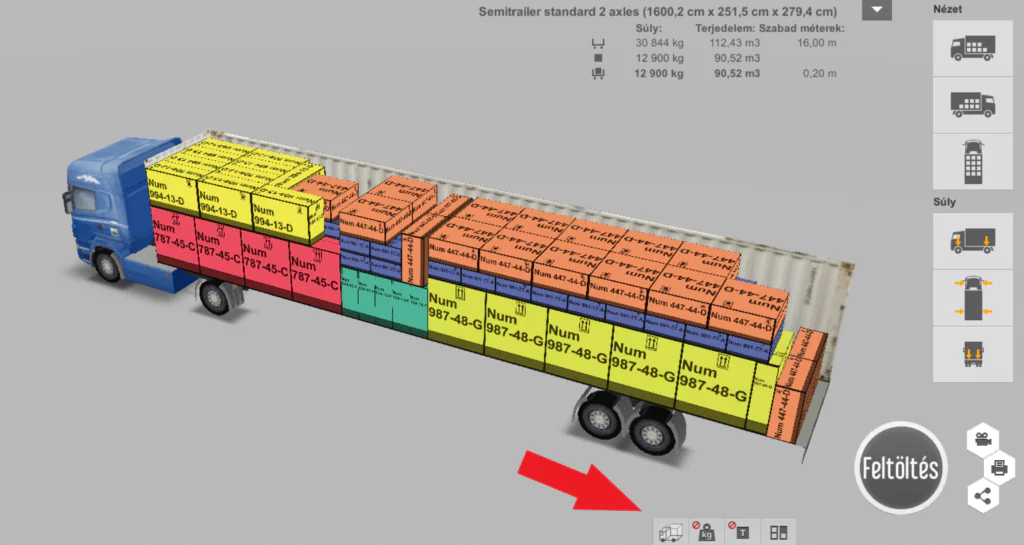 A túlnyúlás beállítása nagyon egyszerű. Amennyiben meg szeretné engedni a rakomány túlnyúlását, kattintson a jobb alsó sarokban lévő terhelési határértékek gomb melletti teherautó ikonra.