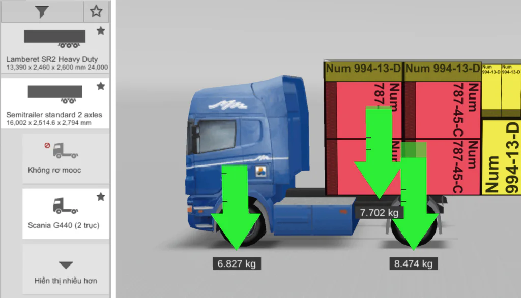 Khi làm việc với rơ moóc kéo hoặc xe tải có thành lật, EasyCargo cung cấp cho bạn các loại máy kéo khác nhau mà bạn có thể nối vào không gian chở hàng đã chọn. Chúng tôi đặc biệt khuyên bạn không nên bỏ qua bước này, vì chỉ với máy kéo, phần mềm mới có thể tính toán tải trọng tải phù hợp và phân bố trọng lượng tải mà có thể là những dữ liệu bạn muốn biết.